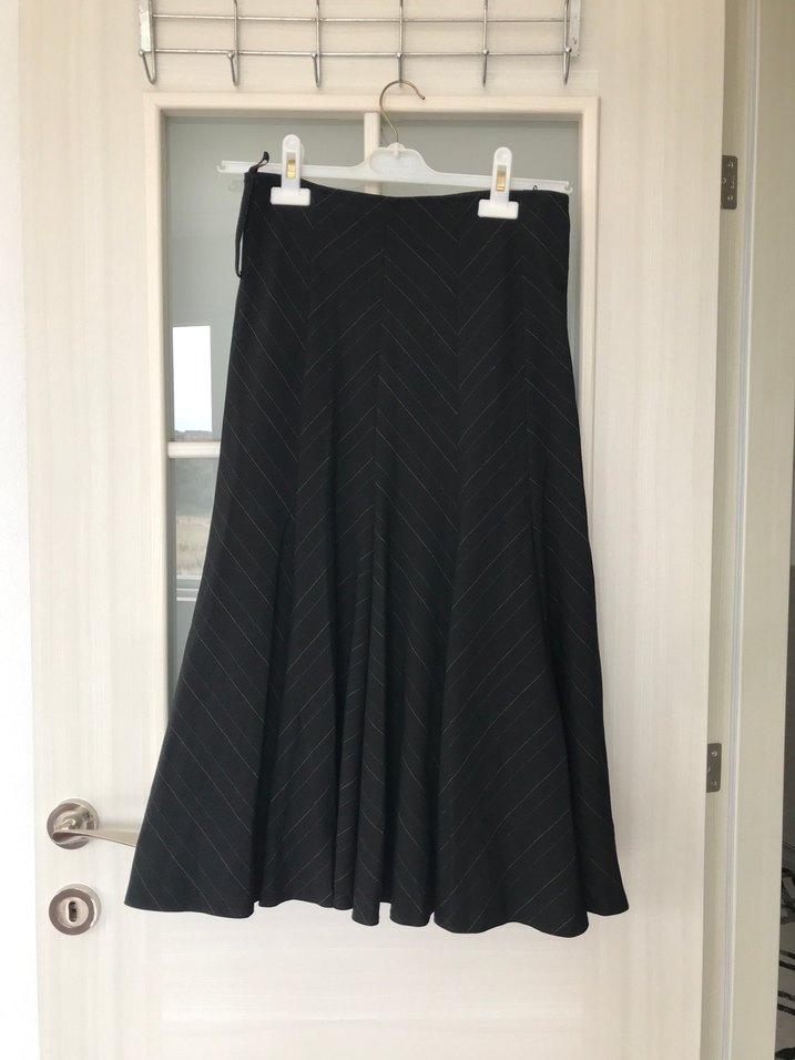 Siyah renkli, çizgili desenli, pileli ve bol kesim midi etek. Sentetik kumaştan üretilmiş, alttan kloş parçalı etek çok şık duruyor boy 76 cm bel 36 cm