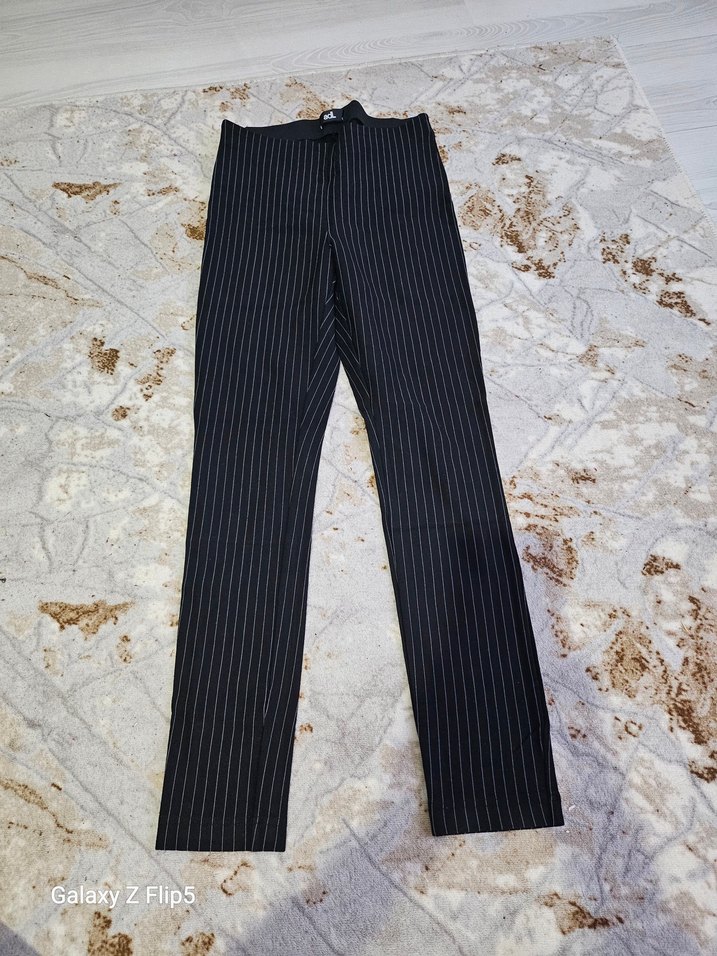 Siyah renkli, çizgili ve pileli detaylara sahip kumaş pantolon. Regular fit ve uzun boylu, iş ve günlük kombinlere uygundur. Sentetik kumaştan üretilmiştir.