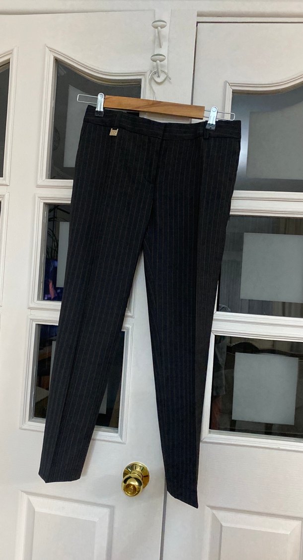 Siyah çizgilikumaştan, pilili ve normal kesim yandan cepli 85 cm uzunluğunda pantolon. Ofis için uygun, trend sokak stili.