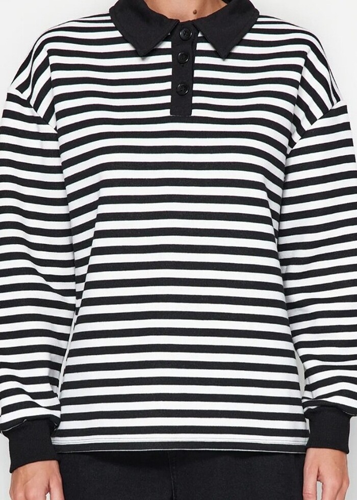 Siyah Çizgili Polo Yaka İçi Polarlı Oversize Sweatshirt