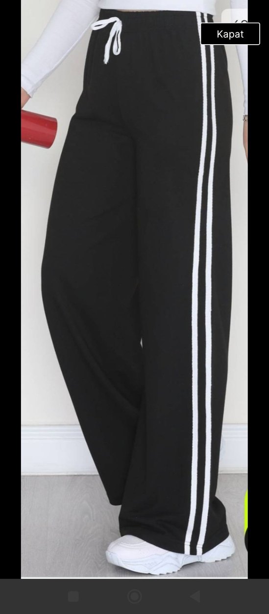 Siyah renk, yanları beyaz çizgili, bol kesim ve elastik bel detaylı kadın eşofman altı. Yumuşak ve sıcak tutan kumaştan üretilmiştir.