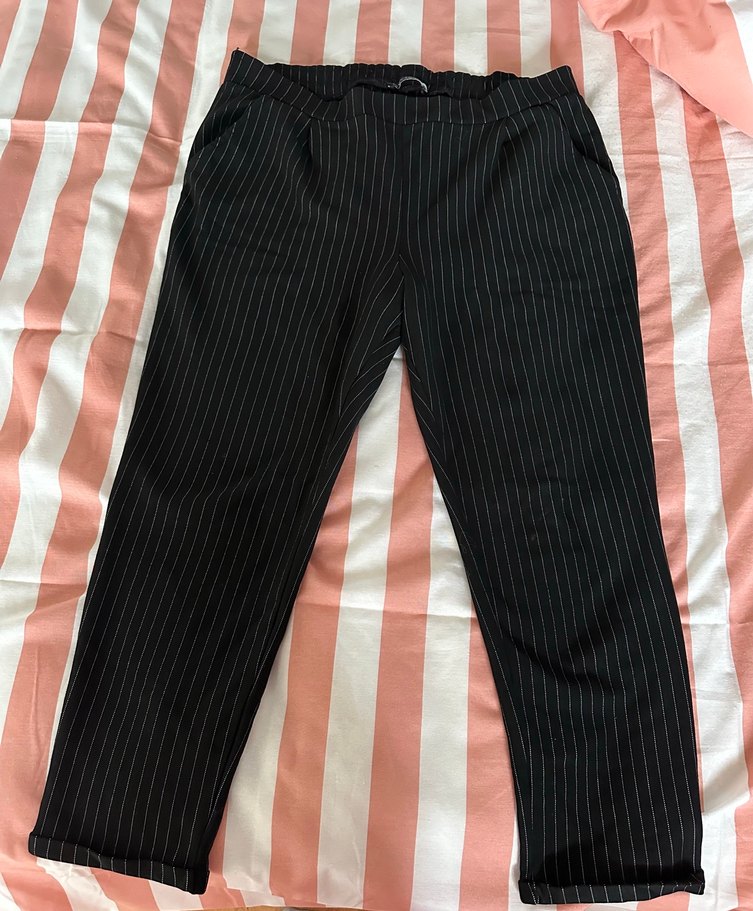 Düz siyah zemin üzerinde ince çizgili, regular fit, midi boy kumaş pantolon. Günlük rahat ve trend athleisure tarzın