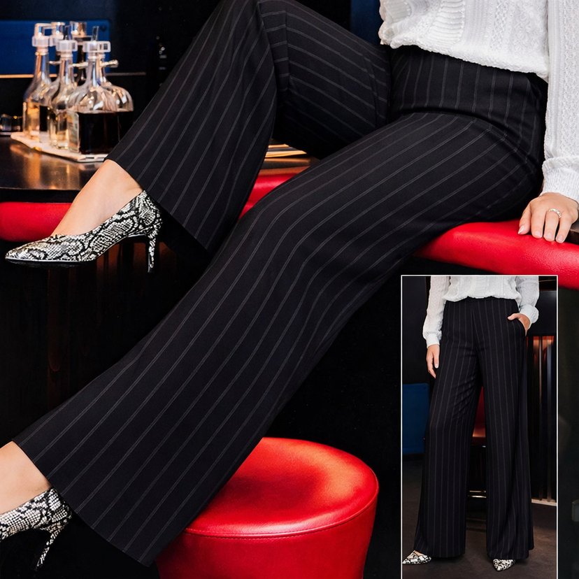 Zamansız siyah rengi ve ince çizgili dokusuyla hem şık hem güçlü bir stil sunan bu pantolon, modern ve iddialı kombinlerin ana parçası olmaya aday. Yüksek bel kesimi beli toparlar, geniş paça formu bacak boyunu daha uzun gösterir. Akışkan ve tok kumaşı sayesinde formunu korur, gün boyu konfor sağlar. Ofis şıklığından akşam davetlerine kadar pek çok ortamda rahatlıkla kullanılabilir. Gömlek, bluz veya crop üstlerle kolayca kombinlenir.