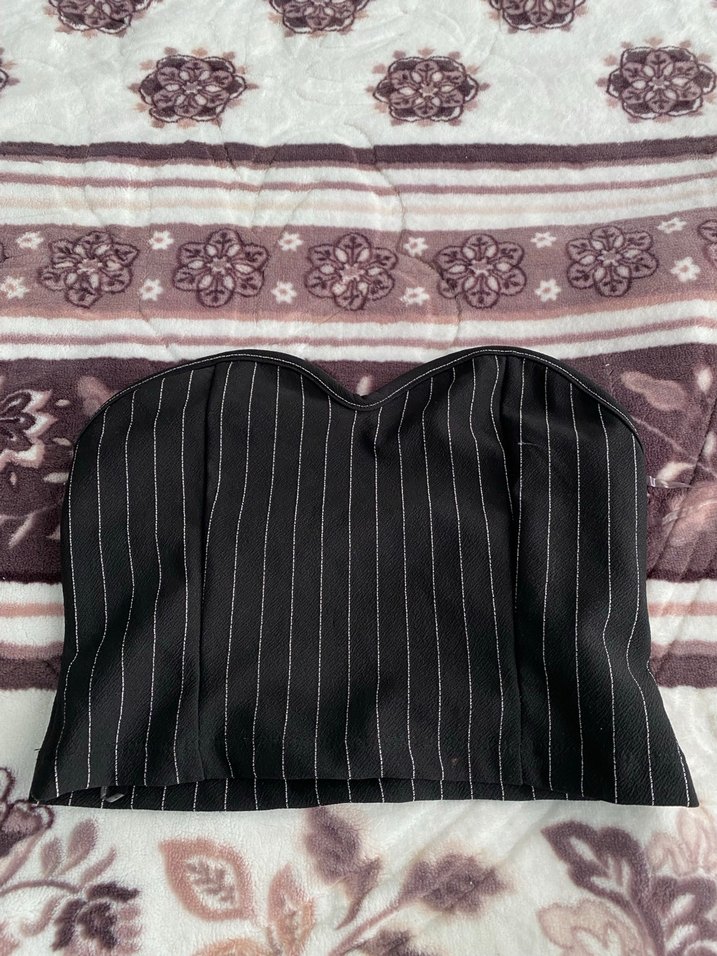 Dikey çizgili ve düğmeli siyah straplez büstiyer, sentetik kumaştan, vücuda oturan kesime sahiptir. Cesur, günlük gotik tarz için uygundur.