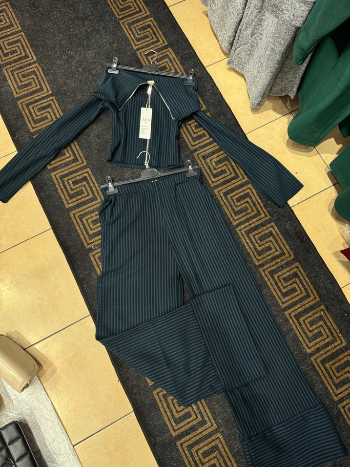 Siyah çizgili, kemerli ve straplez üst ile uzun pantolondan oluşan sentetik kumaş kadın takımı. Sokak modasına uygun, avant-garde tarzda dış mekan kullanımı için ideal.
