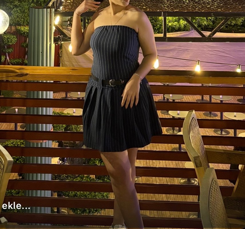 Siyah çizgili denim kumaştan, straplez ve beli kemerli pilili, vücuda oturan midi elbisedir. Romantik buluşmalar için uygundur.