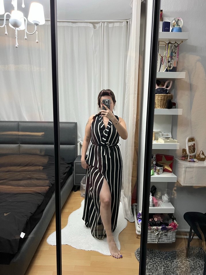 Siyah uzun, dikey çizgili, askılı ve yırtmaçlı elbise. Sentetik kumaştan, bol kesim, günlük kullanıma uygun. Cesur sokak stili için ideal.