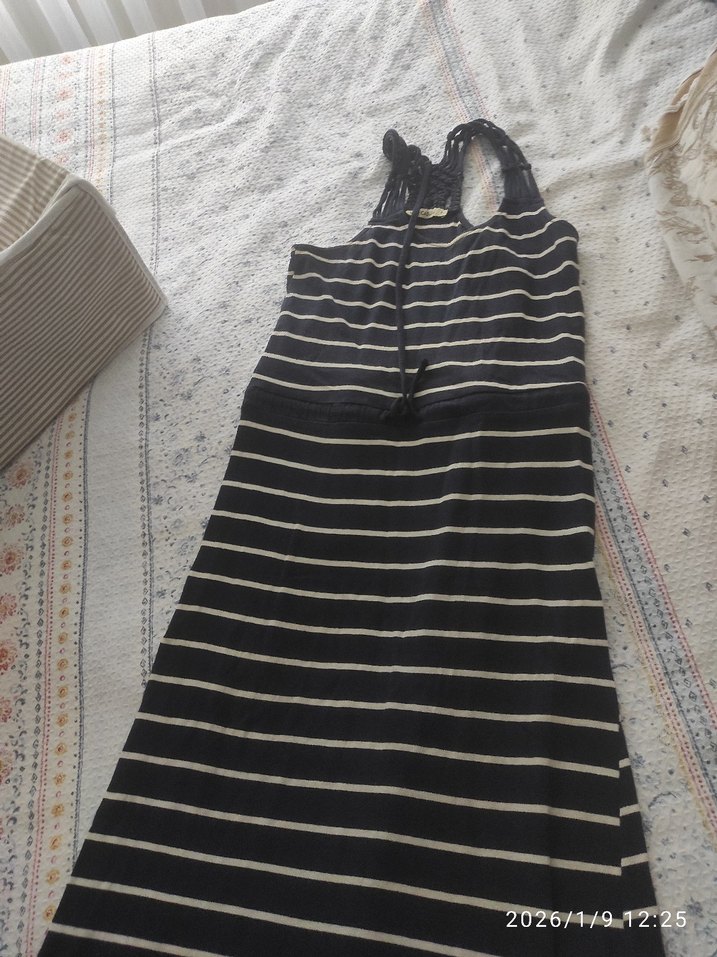 Siyah ve beyaz çizgili, uzun ve fitted kesim elbise. Halter yaka ve askılı kollara sahip, drapeli detaylarıyla rahat ve şık bir sokak tarzı elbise. bilekte uzun beli ayarlamalı penye yazlık elbise