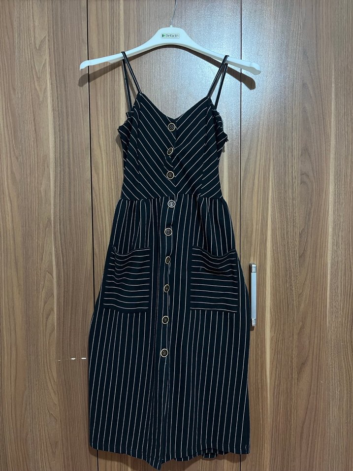 Siyah, ince askılı uzun elbise, dikey çizgili ve düğmeli. İki cep ve vücuda oturan kesimle günlük sokak stili için uygun.