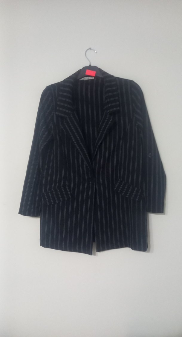 Siyah çizgili kadın blazer, yakalı ve düğmeli tasarıma sahip. Uzun kollu, regular fit ve uzun boylu, ofis ve günlük kullanıma uygun. ürün kullanılmış tertemiz bir ürün mevsimlik harika bir ceket herhangi bir defosu yok