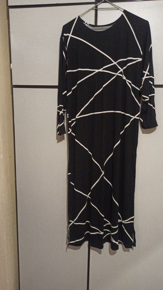 Siyah çizgili uzun elbise, bol kesim ve tekne yaka ile. Sentetik kumaştan, günlük kullanıma uygun, yırtmaç detaylı. özel tasarım sorunsuz hiç giyilmedi.