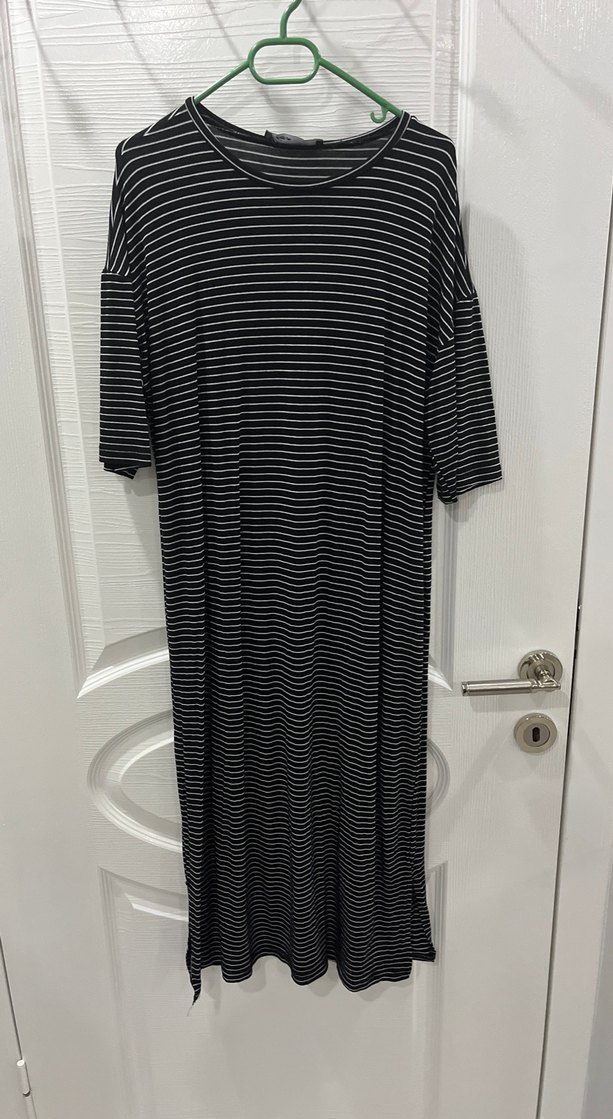 Bu siyah uzun elbise, kısa kollu ve kayık yaka yanları yırtmaçlı tasarıma sahiptir. Bol kesimi, pileli detayları ve çizgili deseni ile gündelik kullanım için uygundur.