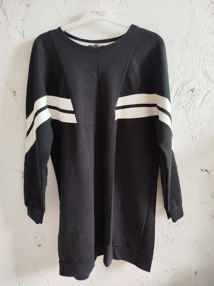 Siyah, uzun kollu ve yuvarlak yakalı sweatshirt, göğüs ve kollarda beyaz çizgilerle. Sentetik kumaştan, bol ve uzun kesimli, rahat ve şık bir sokak stili sunar. çok az kullanıldı