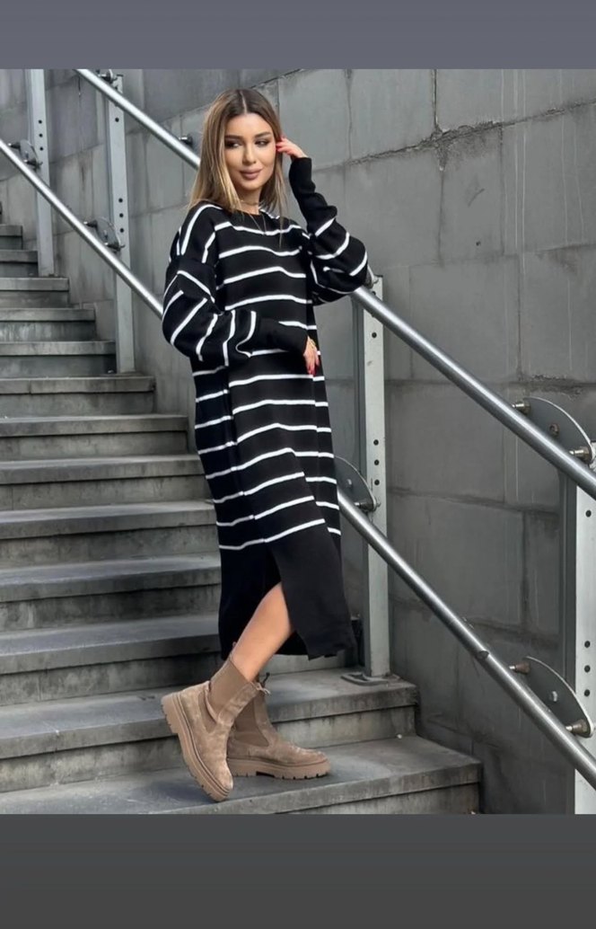 Siyah ve gri çizgili, uzun ve bol kesim örgü elbise. Yuvarlak yaka ve uzun kolludur. Yumuşak yün kumaştan, sokak tarzı için uygun.