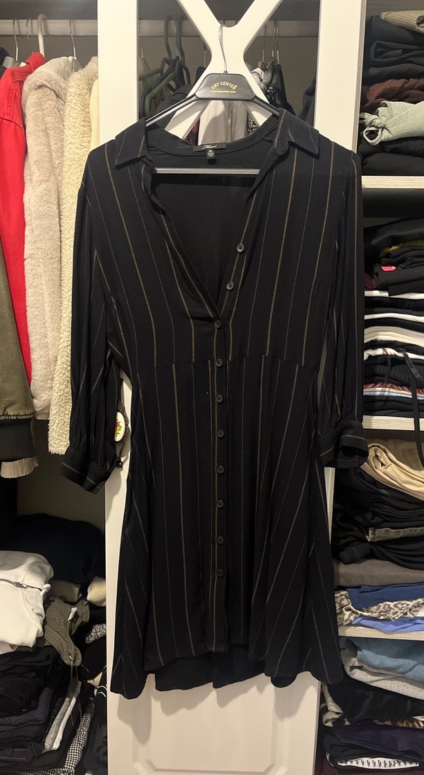 Düğmeli, V yaka, uzun kollu, çizgili, midi boy siyah elbise.