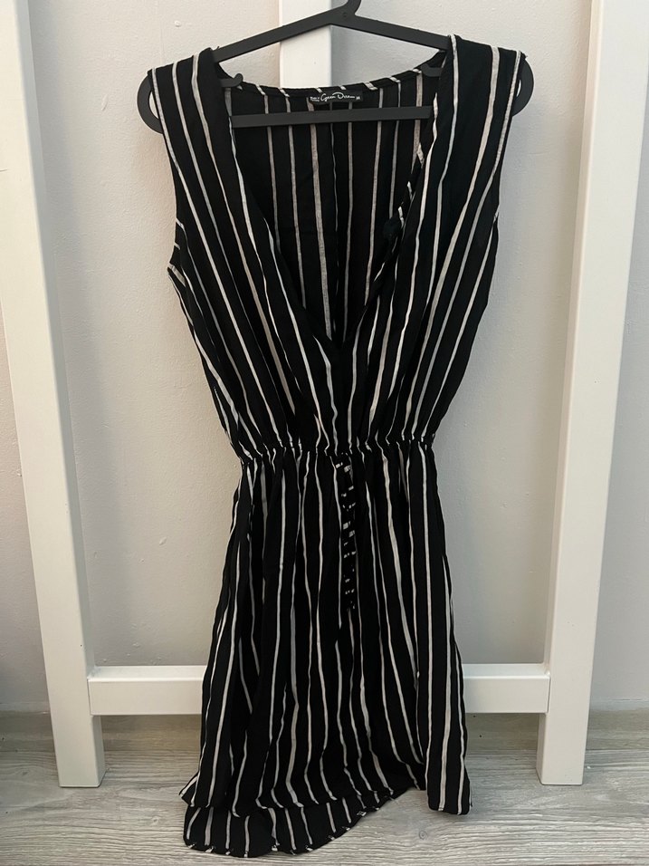 Dikey çizgili, pileli detaylı, V yakalı siyah kadın elbise İnce askılı, sentetik yumuşak kumaştan, ofis için uygun.