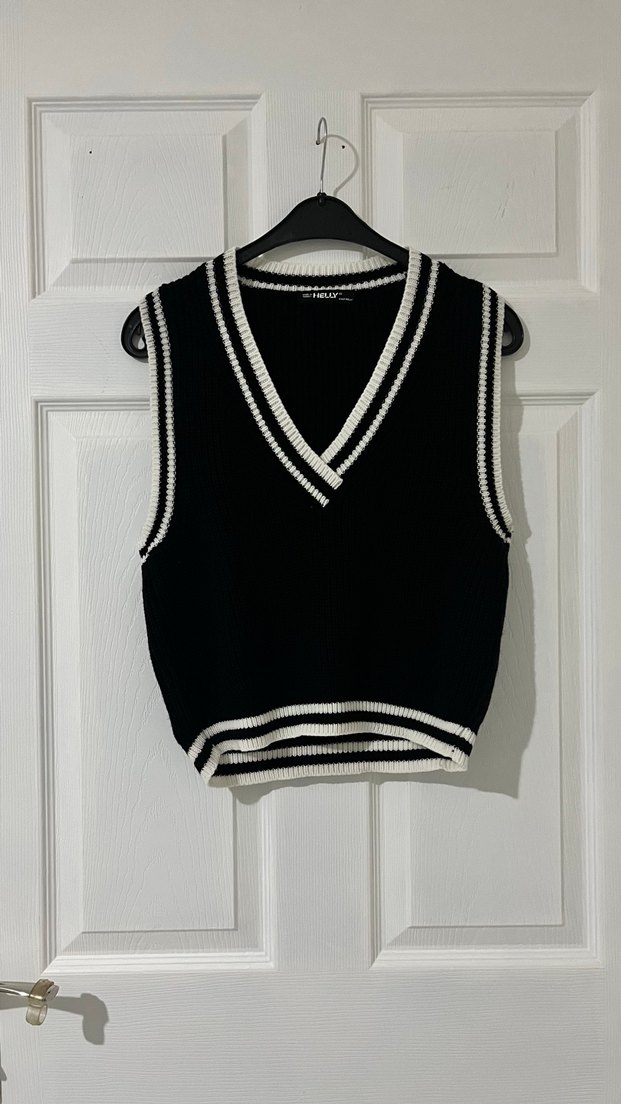 V yaka, çizgili kenar detaylı siyah örme, kollu süveter, gündelik kullanıma uygun.