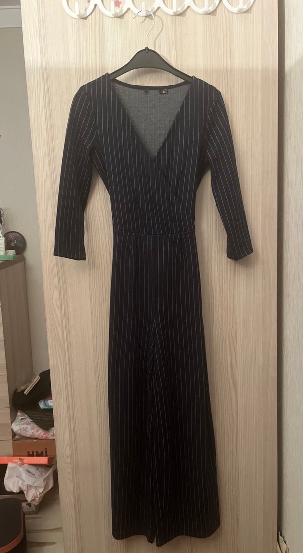 V yaka, pilili detaylı, siyah çizgili, uzun ve dar kesim tulum. Ofis için uygun, spor şık tarzda askılı kollu.