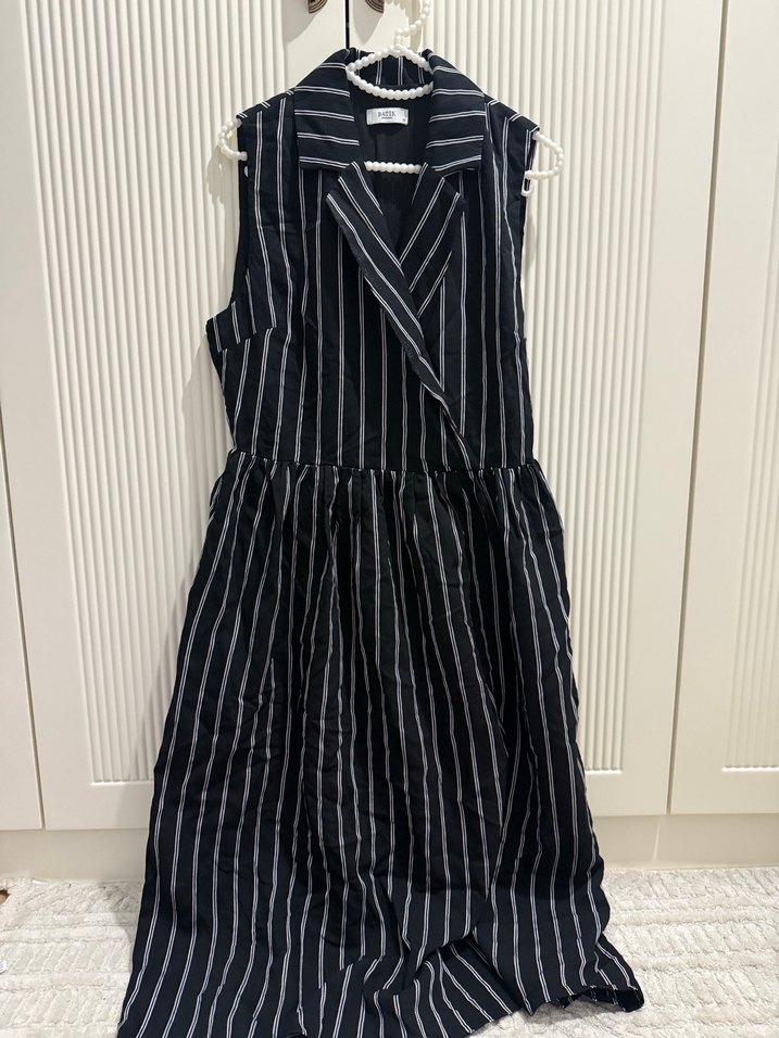 Siyah, çizgili ve V yakalı bu kolsuz elbise, pilili detaylara sahip. Sentetik kumaştan yapılmış, ofis için uygun, normal kesim uzun elbise.