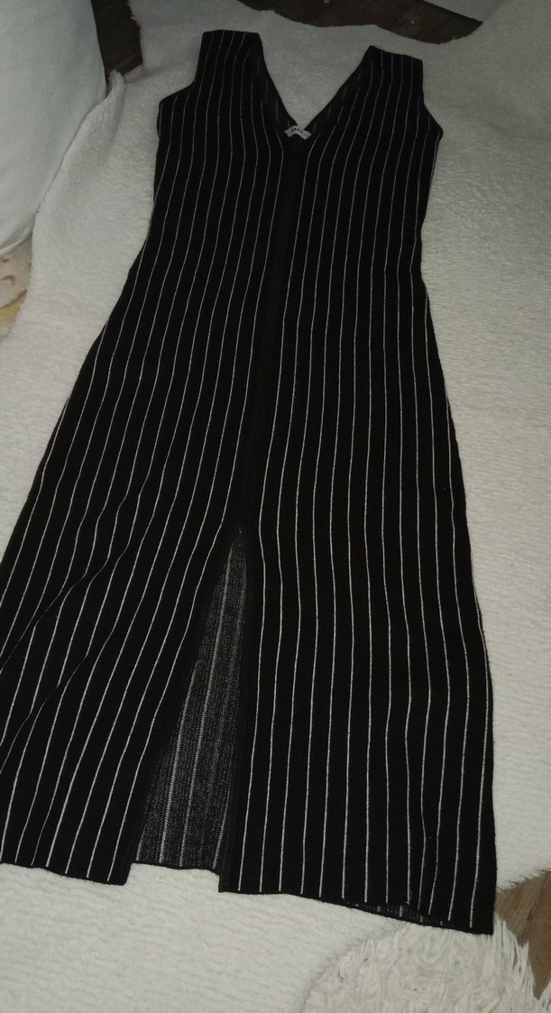 Siyah Çizgili V Yakalı Uzun Elbise