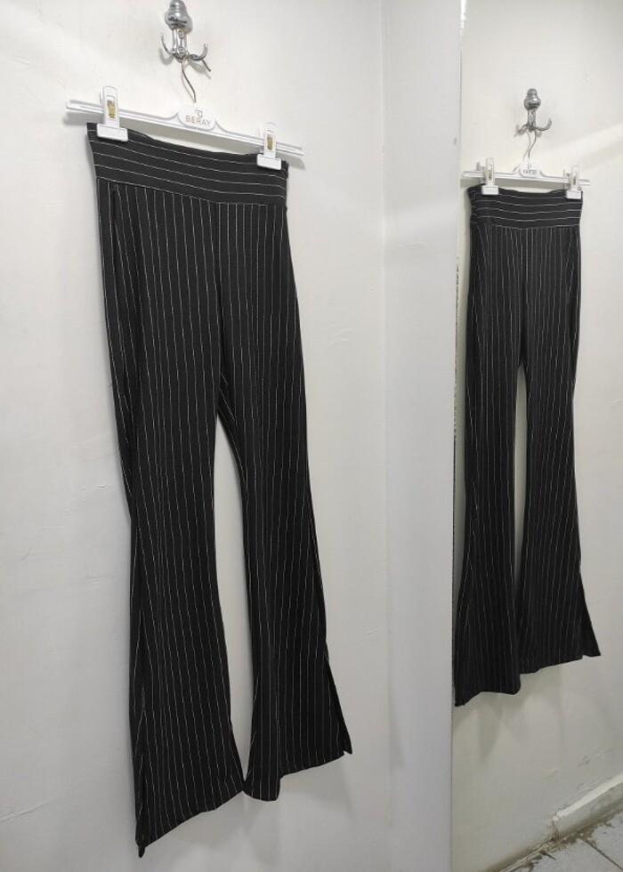 Siyah Çizgili Yırtmaçlı Yüksek Bel İspanyol Paça Tayt Pantolon