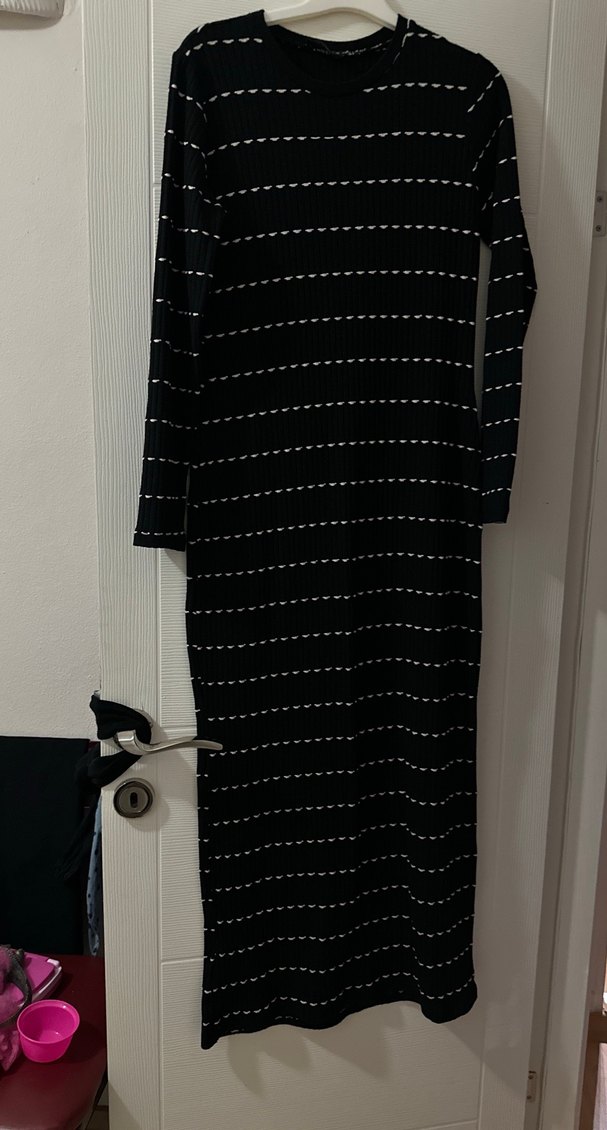 Bisiklet yakalı,çizgili ve ince fitilli kumaştan yapılmış siyah triko elbise, strappy kollu ve vücuda oturan kesimle goth tarzını yansıtıyor.