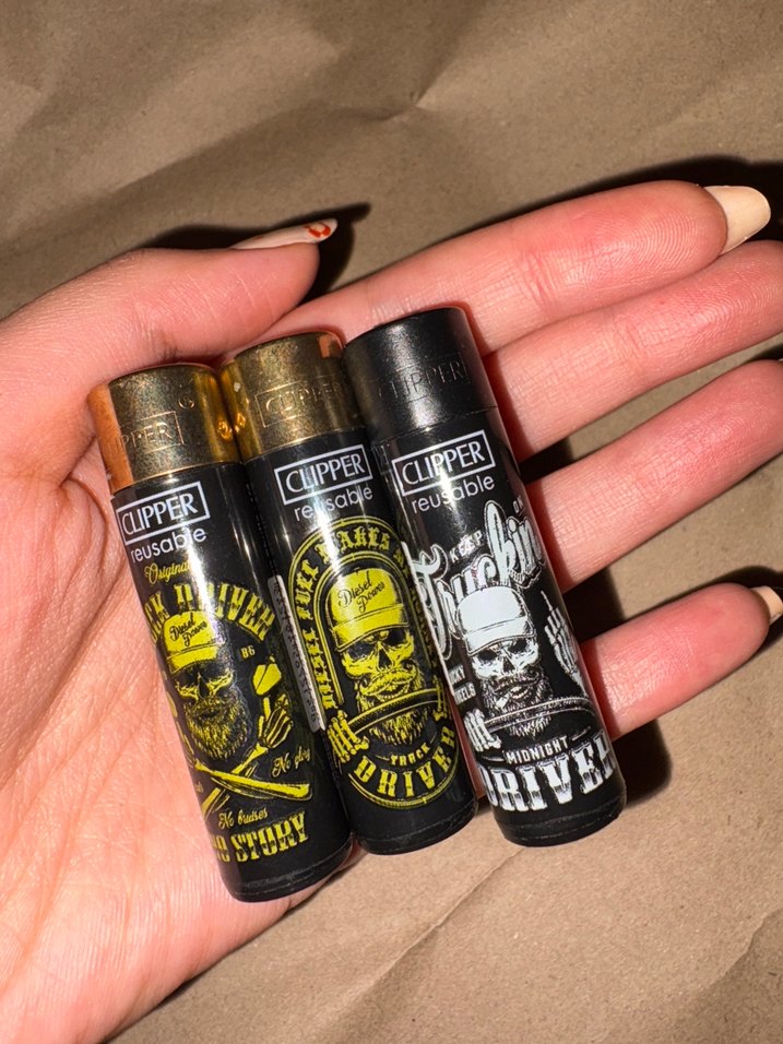 Metal kapaklı siyah Clipper çakmaklardan oluşan set, her biri benzersiz kafatası tasarımlarıyla. Yeniden kullanılabilir ve koleksiyonluk hediye ürünü.