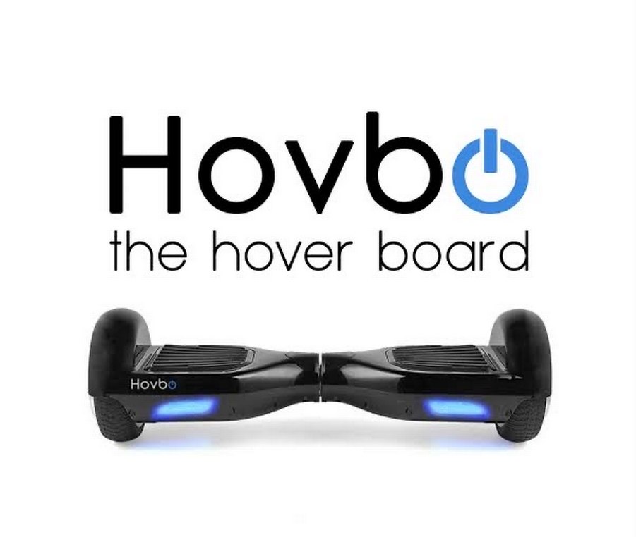 Siyah renkli çocuk hoverboard scooter, LED ışıklar ve sağlam yapıya sahiptir. Üzerinde 'Hovbo' markası yer alır.