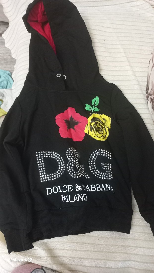 Uzun kollu, kapüşonlu ve payetli D&G logosu ile çiçek baskılı siyah cocuk sweatshirtü. Yumuşak ve sıcak kumaştan günlük kullanım için uygun.