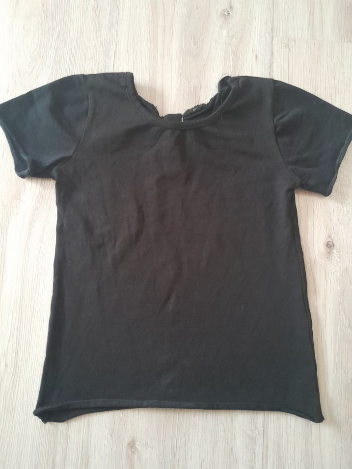Yumuşak kumaştan yapılmış, düz siyah kısa kollu çocuk arka yakada payet fiyonk detaylı
