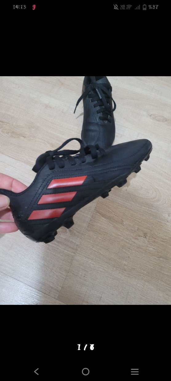 Siyah erkek krampon ayakkabı, bağcıklı ve baskılı kırmızı şeritlere sahip. Spor ve sokak stili için dayanıklı kauçuk tabanlıdır. ⚽