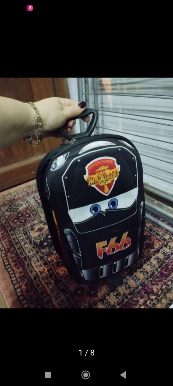 araba desenli siyah çocuk okul çantası. Taşımak için kulpu vardır ve koyu renklidir.