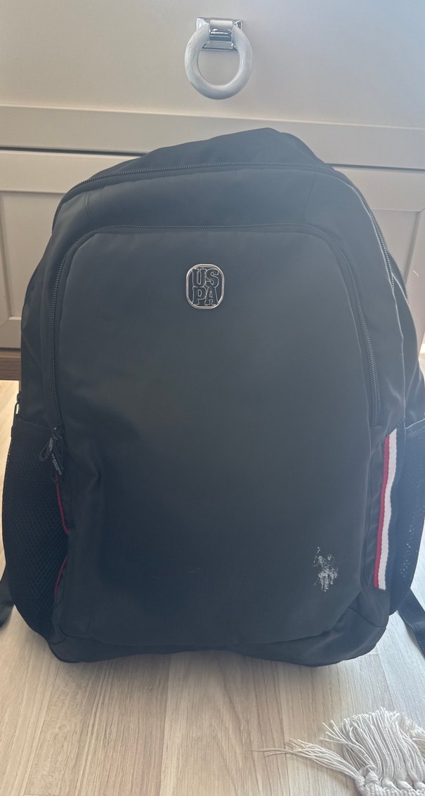 Çok bölmeli siyah çocuk okul sırt çantası, yan file cepler ve USPA logosu ile şerit detaylı.