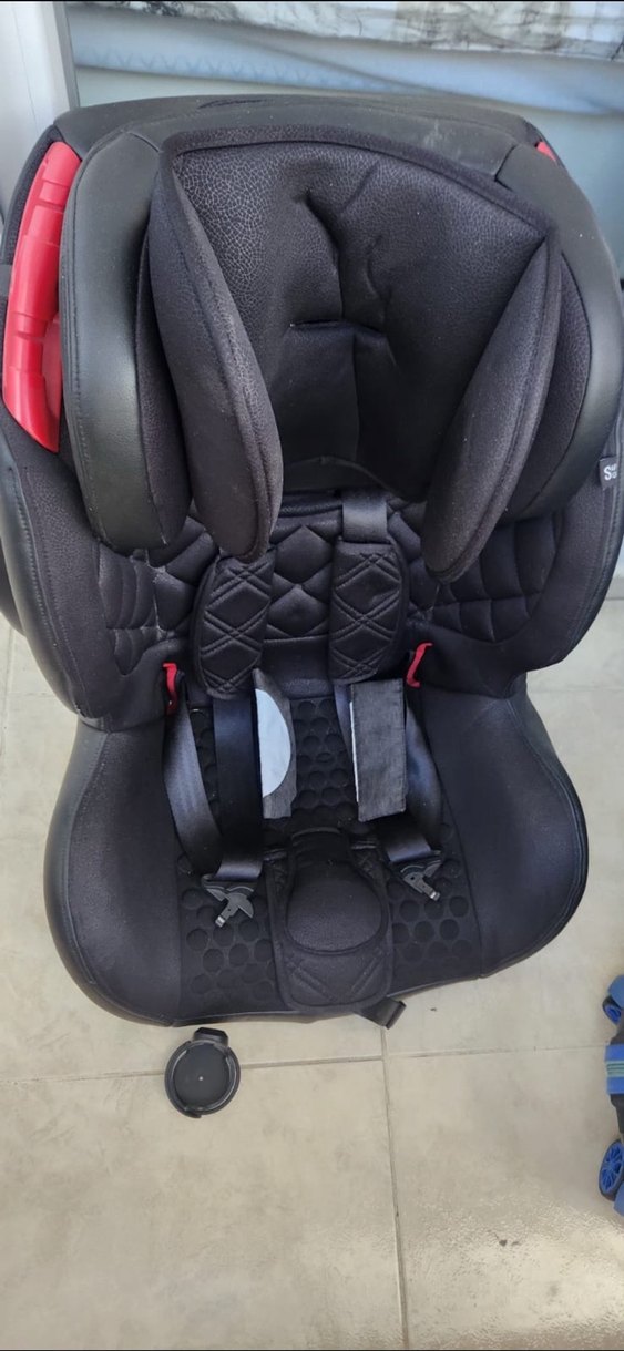Siyah renkli, yanları yastıklı ve ayarlanabilir emniyet kemerli çocuk oto koltuğu. Küçük çocuklar için uygundur.