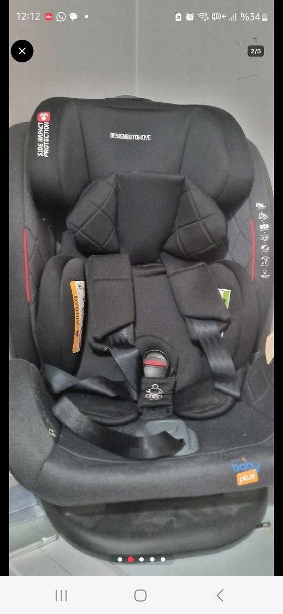 Siyah çocuk oto koltuğu, yastıklı yan koruma ve ayarlanabilir güvenlik kemeri ile. Başlıkta 'DESICNEDTOMOVE' yazısı bulunur. Konforlu ve güvenlidir. İstanbul için elden teslim yapilacaktir