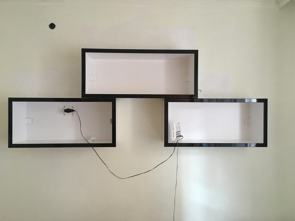 Üç siyah rafdan oluşan set, çocuk eşyalarını düzenlemek için uygun, sade dikdörtgen tasarımlıdır. Koyu renkte ve temiz hatlara sahiptir.