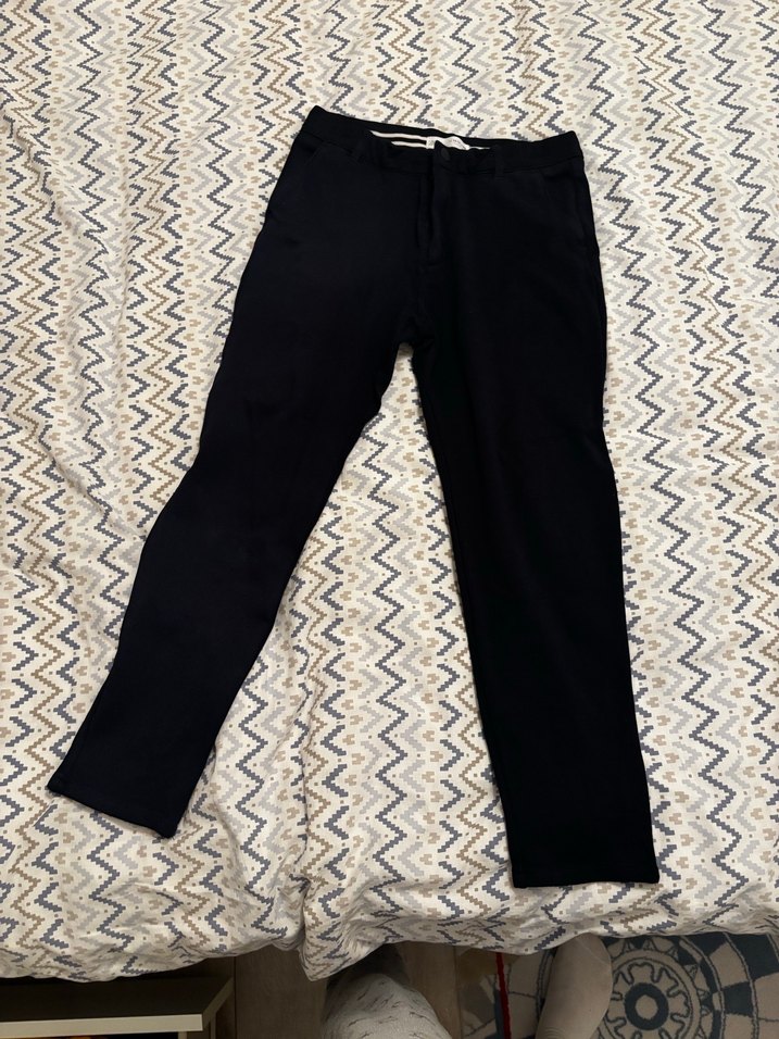 Siyaha yakın lacivert. Oğlumun okulda gösteride siyah pantolon istediklerinde almıştım. 13-14 yaş diyor ama bence 10 -11 yaş gibi. Bayağı kalın penye gibi, kanvas gibi sert değil esnek. Belinde iç kemer esnetme lastiği var. Dizinde hiç belli olmayan örme kısım var fotoğrafını ekledim. Zara.