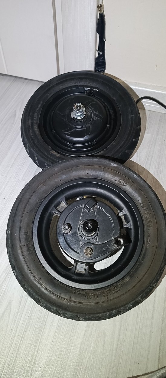 Çocuk scooterları için siyah tekerlekler, dayanıklı malzemeden üretilmiş ve pürüzsüz sürüş sağlar. 36 volt 350 w a l l 10 inçtir şişme havalı lastikler fotoğrafta görüldüğü gibi lastiklerin durumu çok iyidir uzun yıllar sizi götürür İster tek tek ister takım olarak verilir