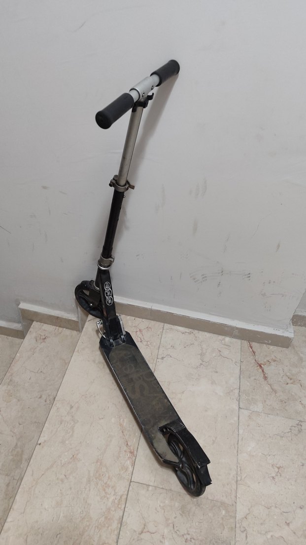 Siyah renkli çocuk scooterı, sağlam gidon ve ince taban ile kolay kullanım sağlar.