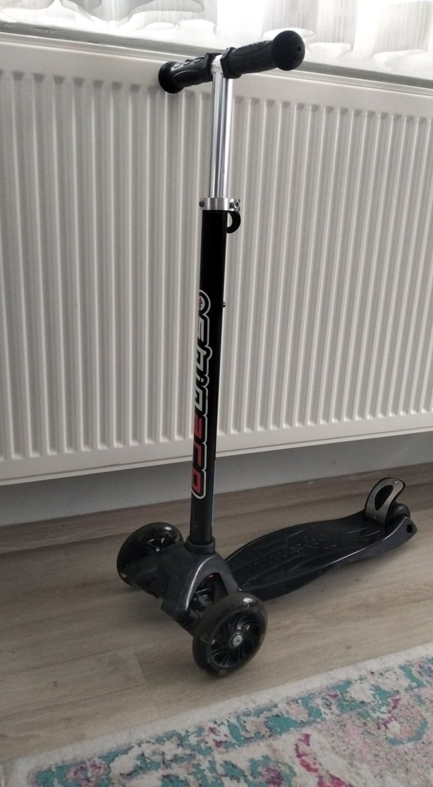Siyah renkli çocuk scooterı, üç tekerlekli ve ayarlanabilir saplıdır. ön ve arka teker ışıklıdır. Az kullanılmıştır. temizdir. herhangi bir sorunu yoktur. Artık küçük geldiği için satılıyor. Shinaro Maxi scooter.