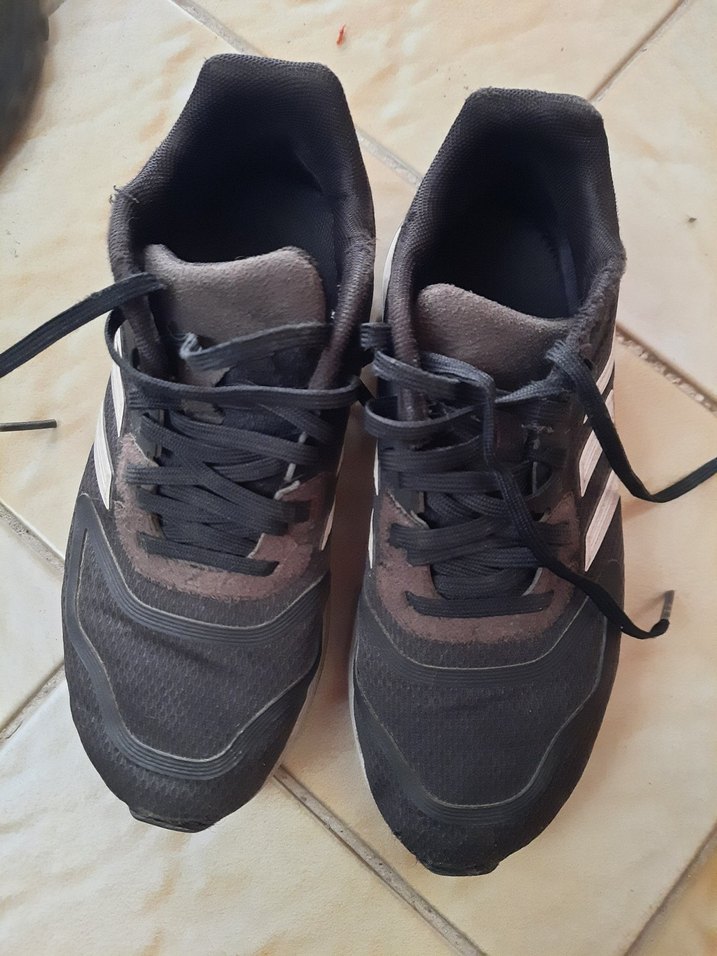 siyah spor ayakkabılarda gri bağcıklar. Sokak stili ve athleisure için uygun, rahat ve kullanışlı. biraz tozlu sadece
