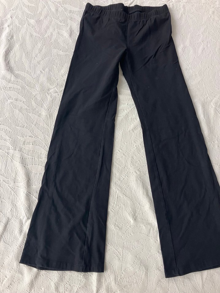 Siyah, düz kesim, midi boy kadın spor pantolonu. Rahat ve şık, sentetik kumaştan üretilmiştir. Spor aktiviteleri için uygundur.
