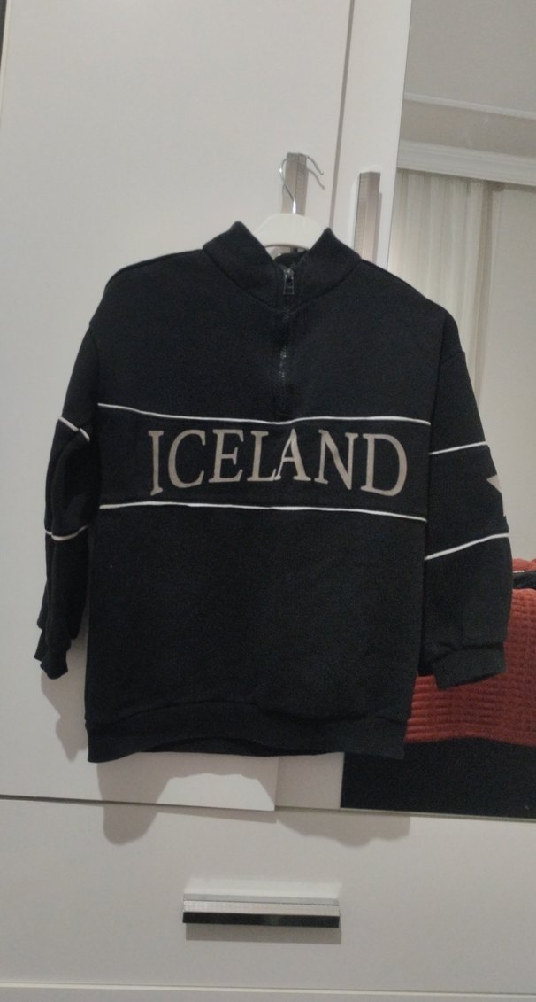 Uzun kollu, bisiklet yaka ve bol kesim siyah çocuk sweatshirt. Örme dokusu ve göğüste 'ICELAND' baskısı bulunur, yumuşak ve sıcak kumaştan üretilmiştir.