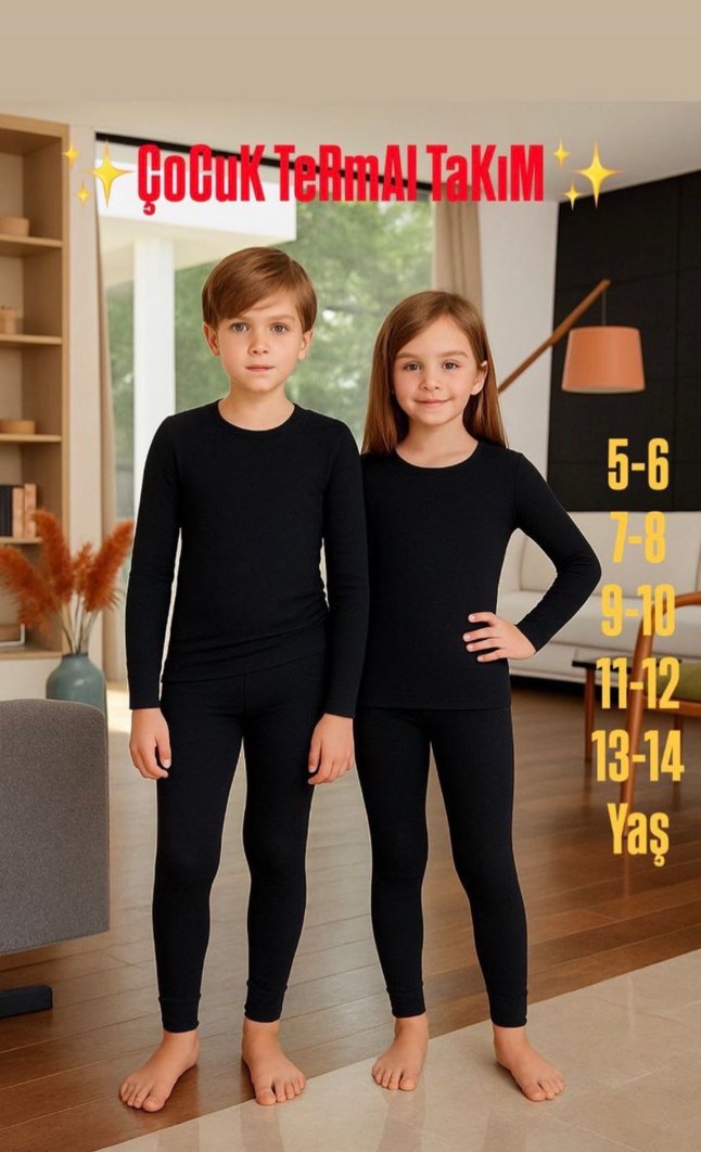 Siyah, desensiz çocuk termal içlik takımı. 5-6 ve diğer yaşlar için uygun, sıcak tutan ve rahat bir yapıya sahip. ❄️