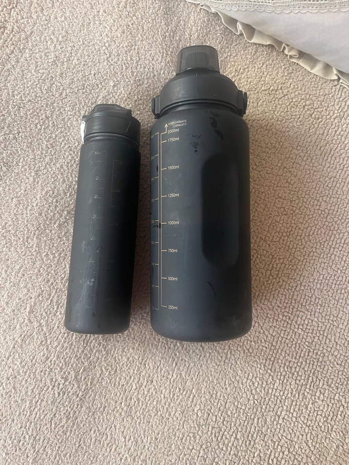 Hacim işaretli, dökülmeyi önleyen kapaklı iki siyah çocuk termos şişesi seti.