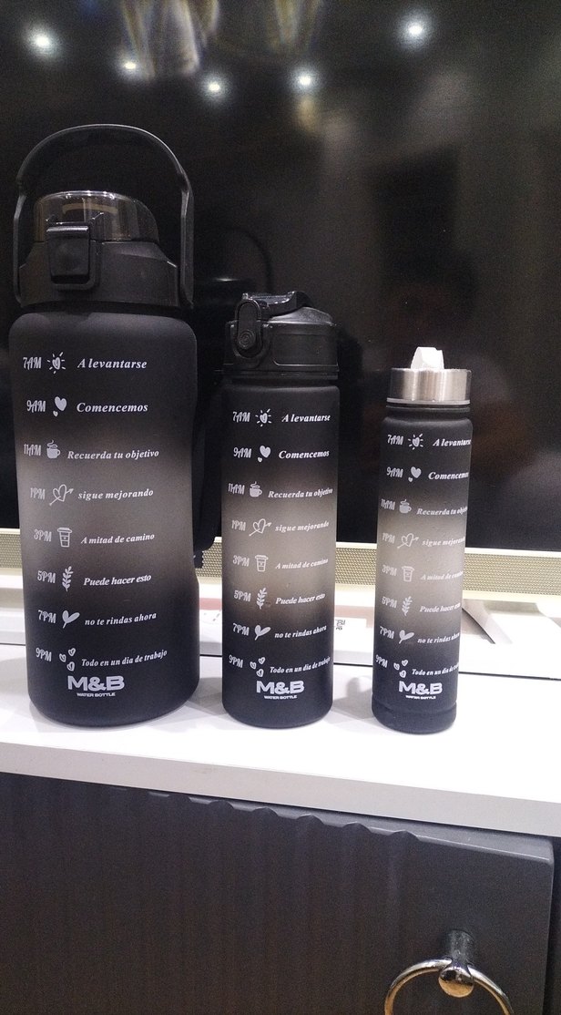 Çocuklar için üçlü siyah termos şişe seti. Her şişede güvenli kapak ve zaman bazlı motivasyon yazıları bulunur.