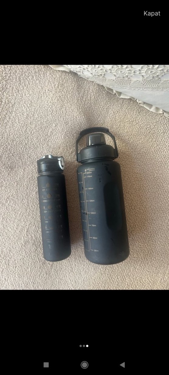 Ölçü işaretli, kapaklı ve büyük şişede taşıma kulplu siyah çocuk termos şişeleri seti.