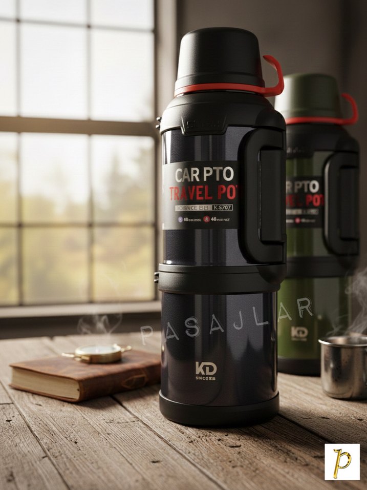 Siyah renkli, saplı ve güvenli kapaklı çocuk termos şişesi. İçecekleri uzun süre sıcak tutar, taşıması kolaydır. ☕