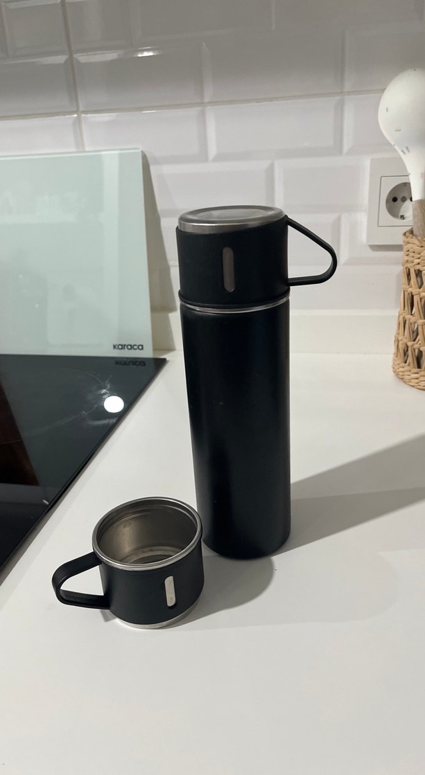 Siyah renkli çocuk termos şişesi, kulplu çıkarılabilir bardak ve kolay taşınabilir tasarıma sahiptir. ☕