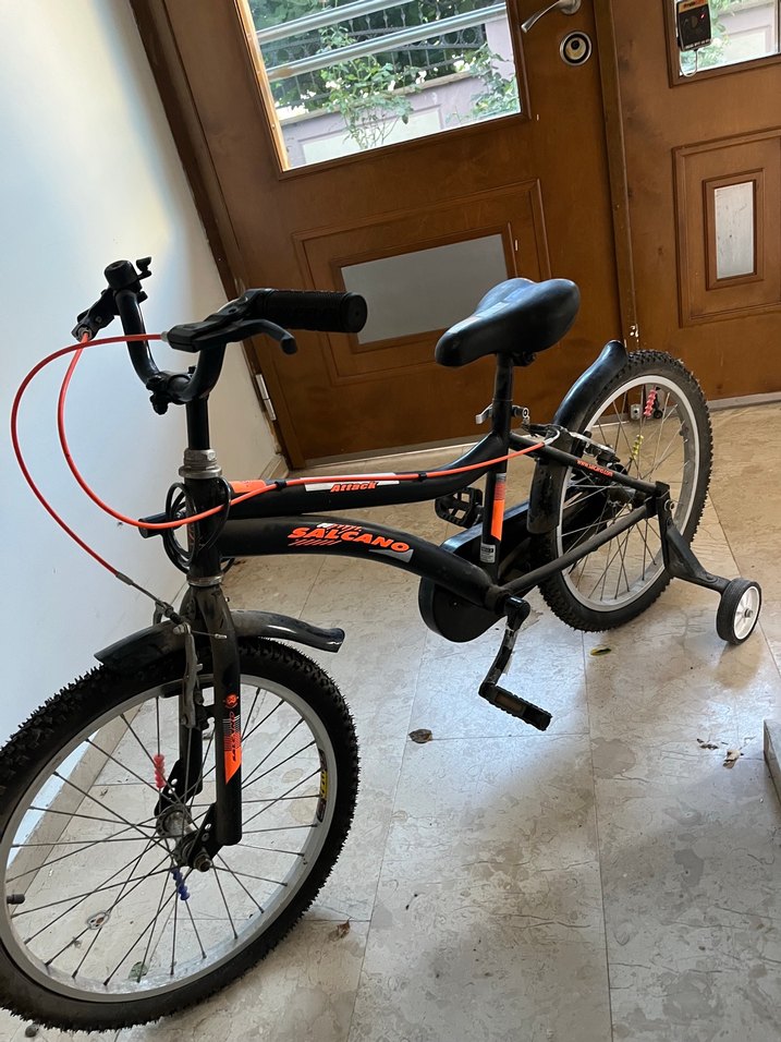 Kırmızı fren kablolu, denge ve stabilite için destekli siyah çocuk üç tekerlekli bisiklet. Temiz kullanılmıştır
